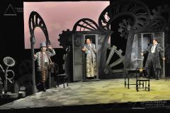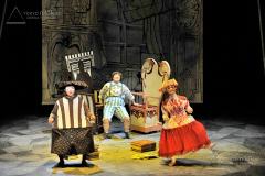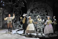 もう一人の恋人、ドン・イニーゴ・ゴメス(中・佐原壮也)は大時計にお腹が挟まってしまいます。そこへトルケマダ(左・大川信之)が帰ってきました。
